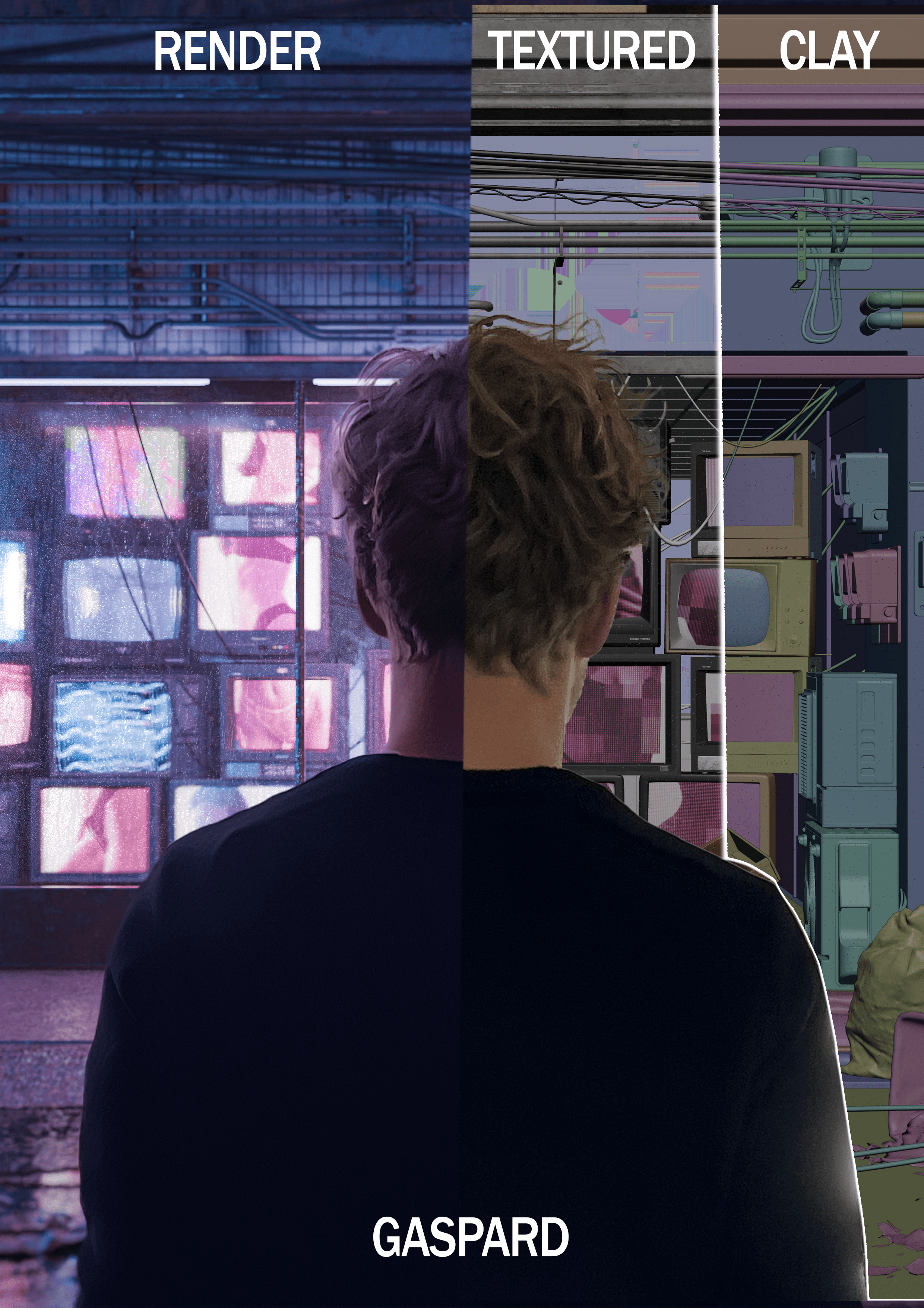 The main environment was created in 3D to precisely control lighting, composition, and atmosphere. A photograph of Gaspard G was then integrated into the scene during the compositing stage.