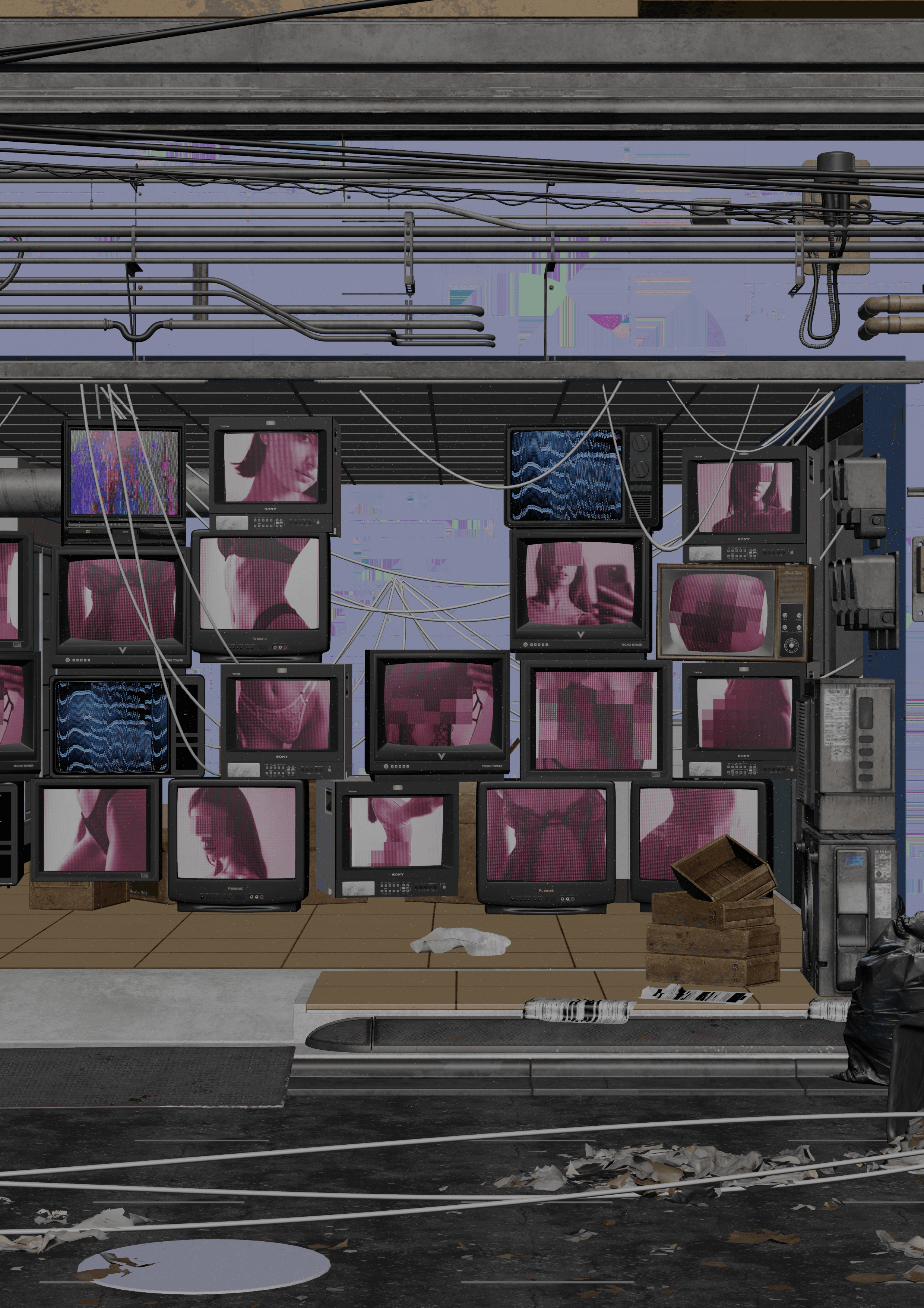 These screens symbolize the exposure of intimacy and its transformation into a consumable product. Positioned in front of this illuminated storefront, the character represents the viewer confronting this commodification.